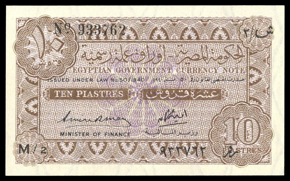Egypt. Egyptian Government. 10 Piastres. No date (1940). P-166c. Arabic and Western serial No. 933762. Brown on lilac. Blue back with Citadel. With geometric watermark. Uncirculated.