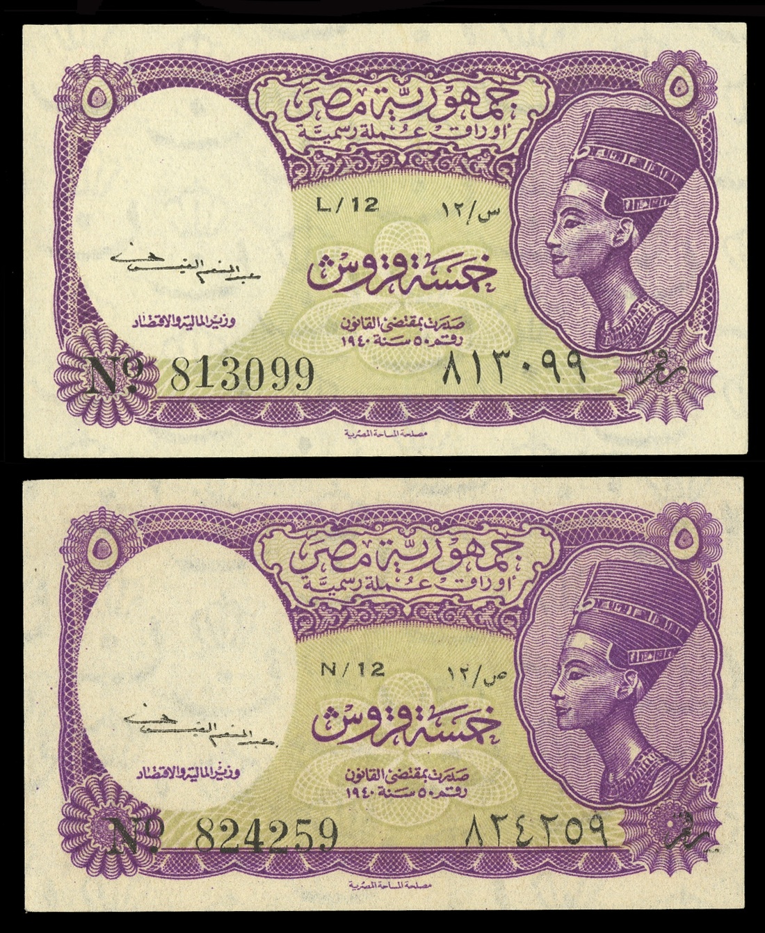 Egypt. Egyptian Republic. Colorful 5 Piastres Grouping. No date (1952-1958). Queen Nefertiti. P-174a Uncirculated;(2) P-174a AU; P-174b Uncirculated. (5)