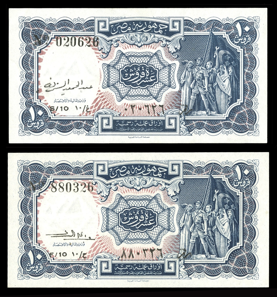Egypt. Egyptian Republic Currency. P-175a 10 Piastres Signature Variety Grouping No date (1952-58). Gray-blue to black, tan underprint. Flag with crescent and three stars. All three different signature varieties are represented. EF; AU; Uncirculated, with minor ink stain on the back. (3)