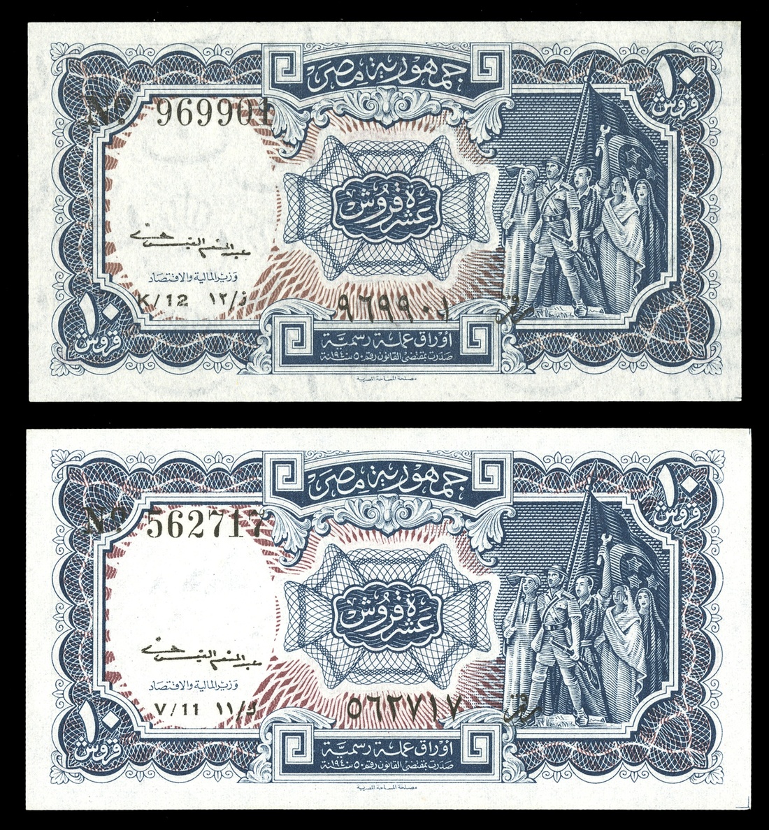 Egypt. Egyptian Republic Currency. P-175a & 175b 10 Piastres Pairing No date (1952-58). Gray-blue to black, tan underprint. Flag with crescent and three stars. Both watermark varieties are represented here. Both Uncirculated. (2)