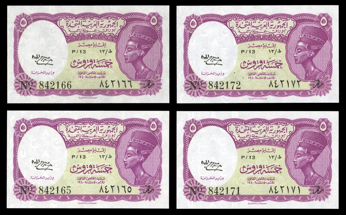Egypt. United Arab Republic. Colorful P-176c 5 Piastres, Consecutive Number Runs. No date. Queen Nefertiti. U A R letters in the watermark. Uncirculated. (9)