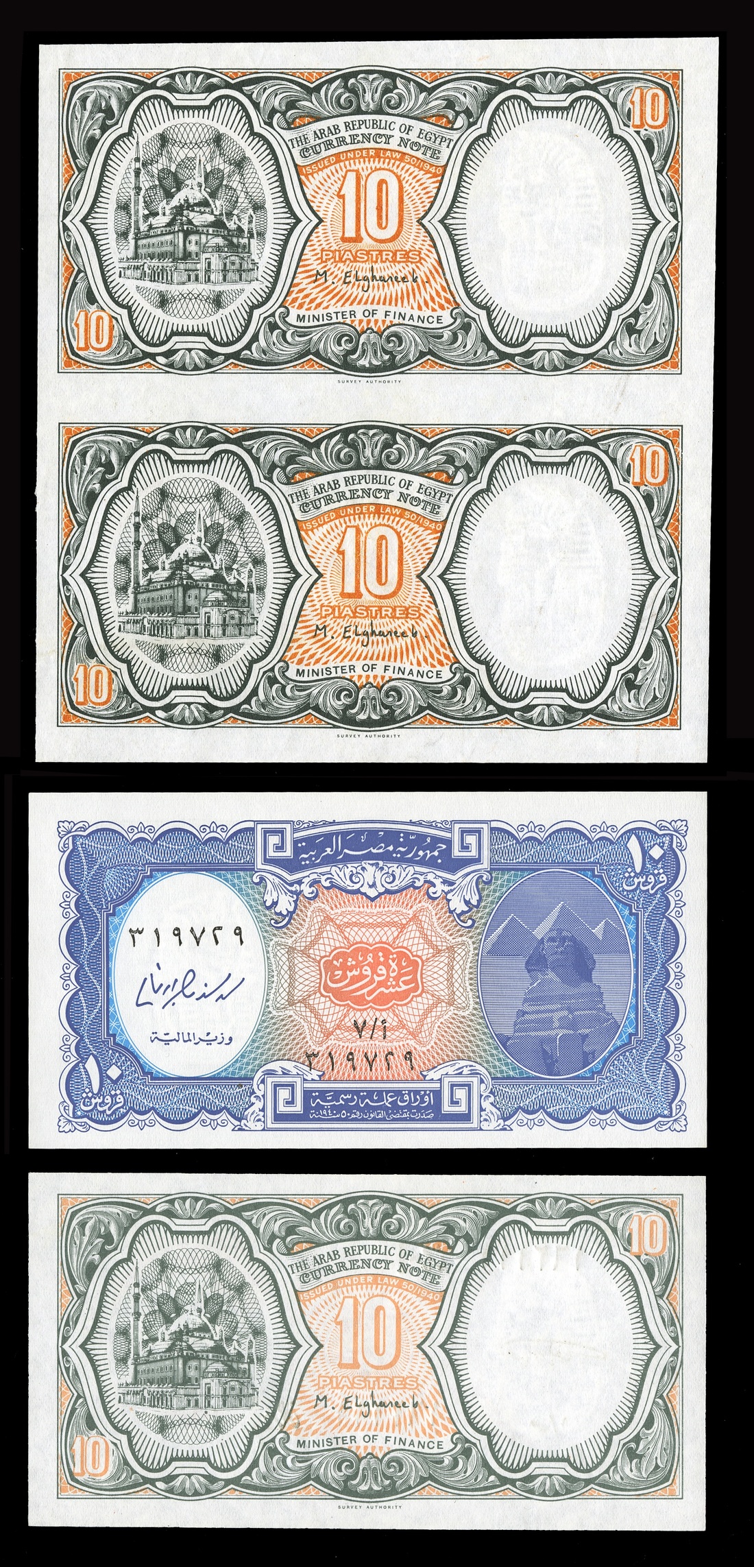 Egypt. Arab Republic of Egypt. Colorful 10 Piastres P-187 Selection and Others. Sphinx, pyramids, right. P-187. Orange and black. Uncut sheet of two, no serial numbers or signatures. Uncirculated. Two issued P-187 examples, Uncirculated; P-189 Uncirculated.(3) P-189 with a light blue center VF-EF, and five others, blue on orange, Uncirculated. Sold as is, no returns. (13)