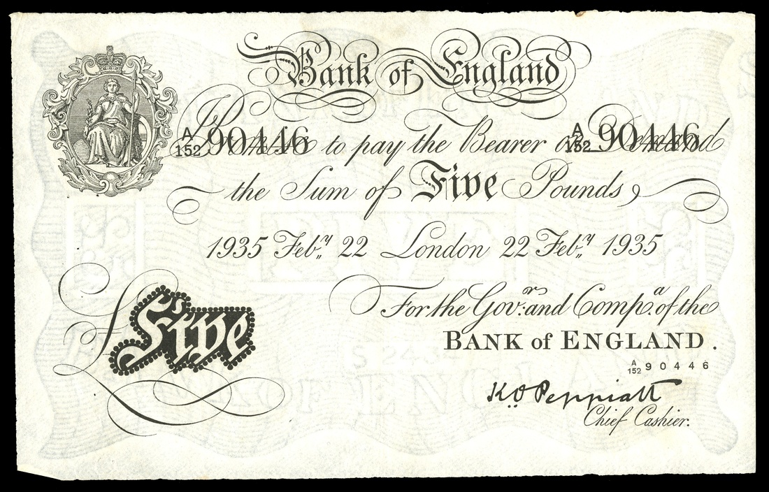 Great Britain. Bank of England, K.O. Peppiatt. 5 Pounds. London. February 22, 1935. No.A/152 90446. Black and white, ornate crowned vignette of Britannia top left. Value in black tablet at lower left. (B 241). Very Fine with a few scattered tiny pinholes, left.