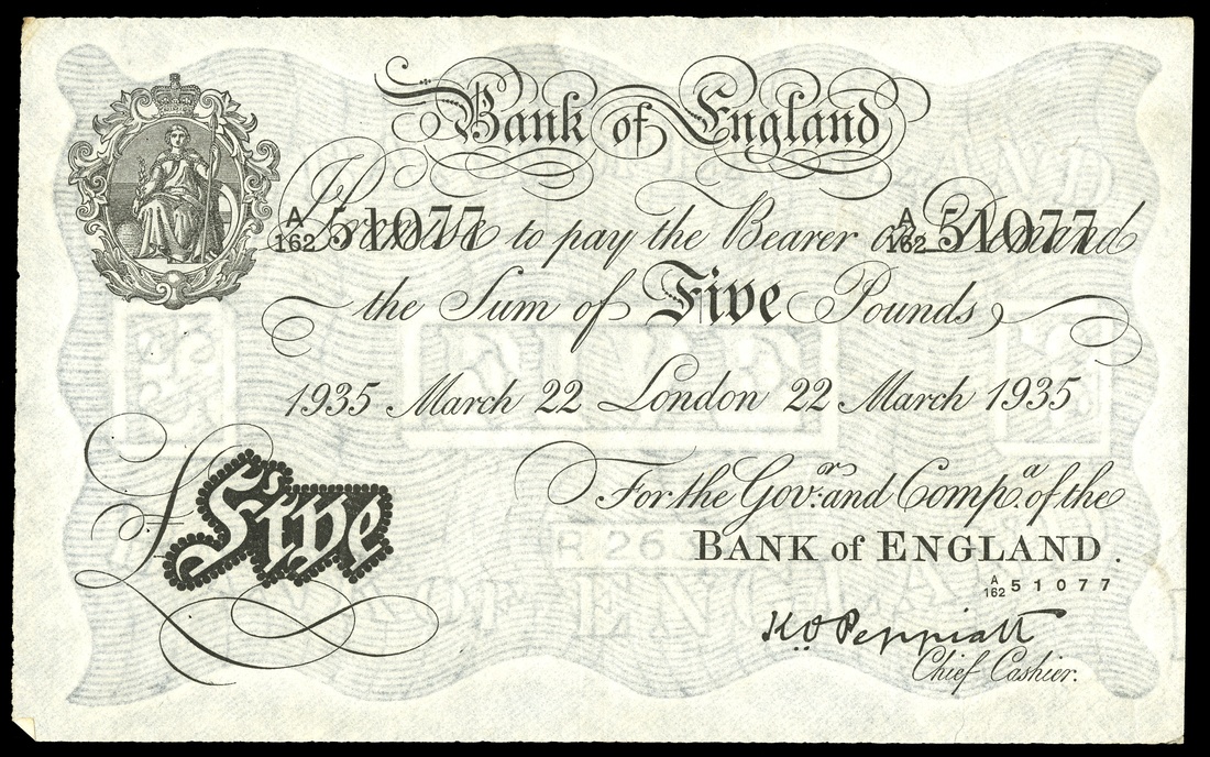 Great Britain. Bank of England, K.O. Peppiatt. 5 Pounds. London. March 22, 1935. No.A/162 50177. Black and white, ornate crowned vignette of Britannia top left. Value in black tablet at lower left. (B 241). Extremely Fine with a few scattered tiny pinholes, left. Light corner tip folds are mentioned merely for the sake of accuracy. Very pleasing.