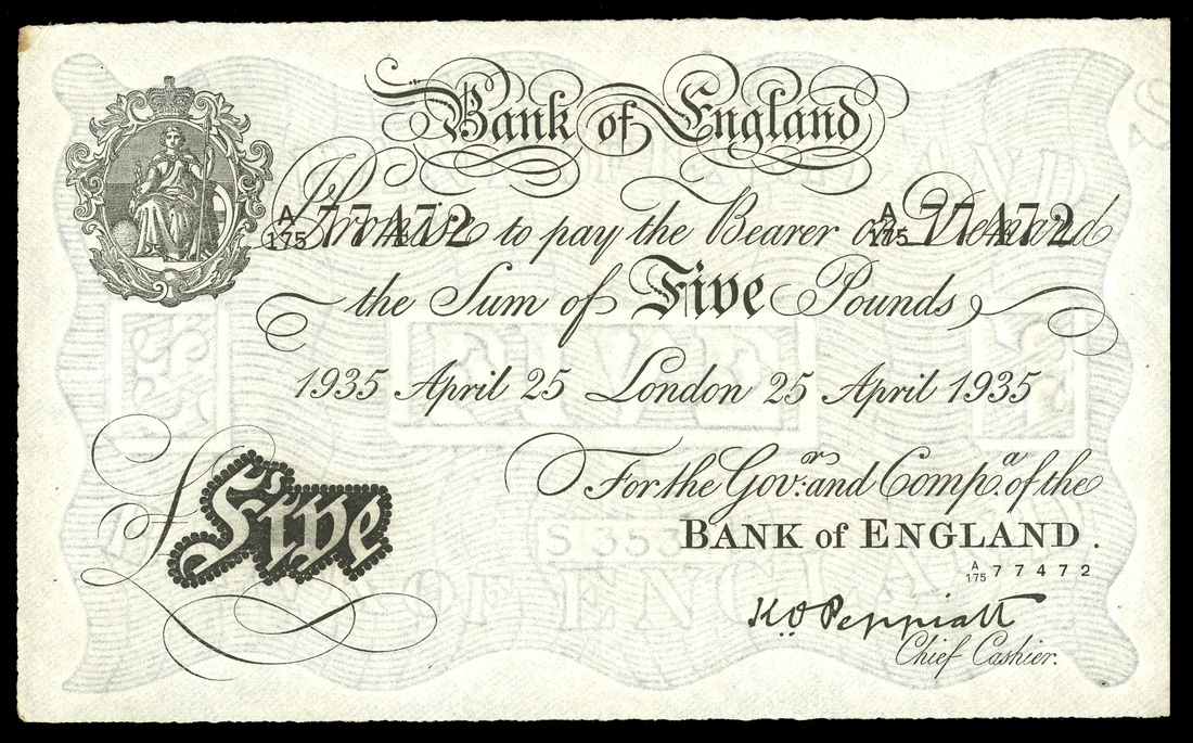 Great Britain. Bank of England, K.O. Peppiatt. 5 Pounds. London. April 25, 1935. No.A/175 77472. Black and white, ornate crowned vignette of Britannia top left. Value in black tablet at lower left. (B 241). Extremely Fine with a few scattered tiny pinholes, left.. A trivial stain in the upper left corner, but otherwise fresh and bright.