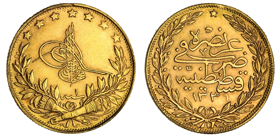 Turkey. Ottoman. Mehmet VI (AH 1336-1341/1918-1923 AD). 100 Kurush, accession AH 1336, year 1. Toughra, stars above, year, crossed quiver and spray below. KM 821. About Uncirculated.
