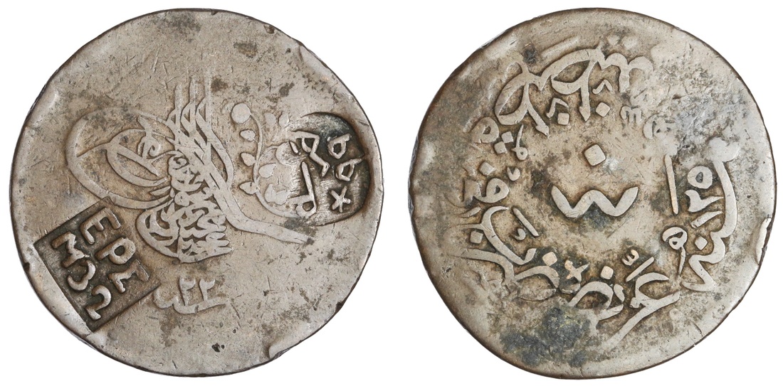 Turkey Ottoman. Countermarked AE Coinage. Eresos (Lesbos). Value "32". EP?/M32 in rectangle c/m on obverse of a Turkish 40 Para, accession AH 1255, year 22. Wilski G5-05a. With additional c/m (Wilski A-28-01c) in Arabic, dated [18]99. C/ms Very Fine on Fine host.