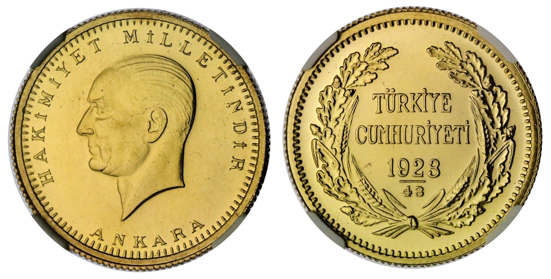 Turkey. Republic. 250 Kurush, 1923 / 43. Ataturk head left. KM 857. Mintage of 1,008. NGC MS 63.