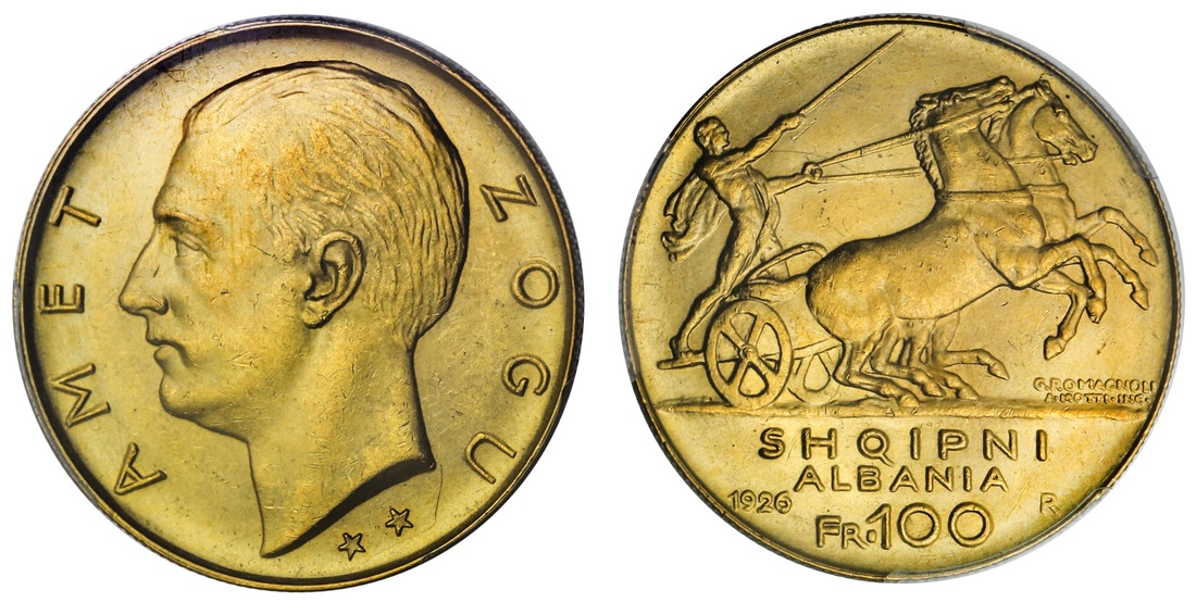 Albania. Amet Zogu, President (1925-1928). 100 Franga Ari, 1926 R. Roma. Bare head left, two stars below, rev. Robed driver in biga galloping right, designer's name G.ROMAGNOLI below. KM 11.3. PCGS MS 62.