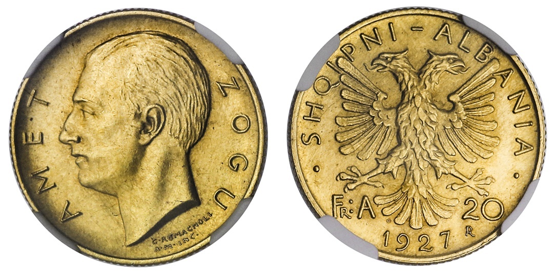 Albania. Amet Zogu, President (1925-1928). 20 Franga Ari, 1927 R. Roma. Bare head left, rev. Albanian eagle. Fr.2, KM 10. NGC AU 58.