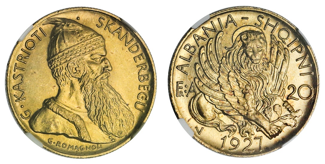 Albania. Amet Zogu, President (1925-1928). 20 Franga Ari, 1927 V. Vienna. Skanderbeg bust right, G. ROMAGNOLI below, rev. Lion of San Marco. Fr.6, KM 12. NGC MS 65.