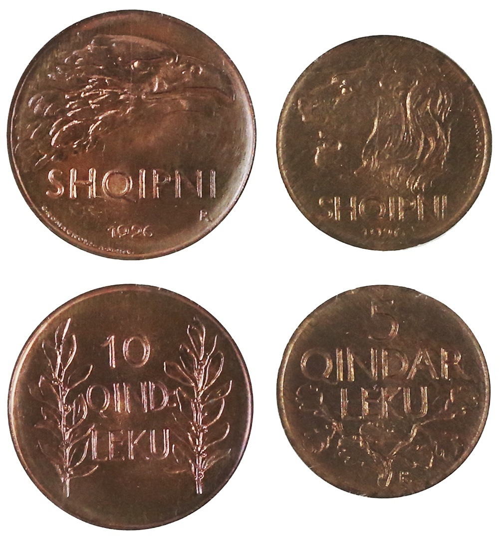Albania. Amet Zogu, President (1925-1928). High-grade pair: 5 and 10 Qindar Leku, 1926 R. Roma. Lion head left; Eagle head right. KM 1, 2. Both NGC MS 65 RB. Lovely coins. (2)