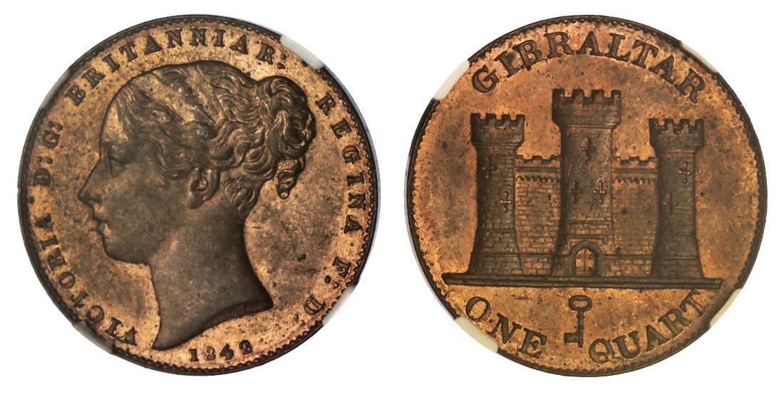 Gibraltar. Victoria (1837-1901). Quart, 1842/0. Young head left, rev. Castle with three towers, key below. KM 2. NGC MS 64 RB. A lovely example.