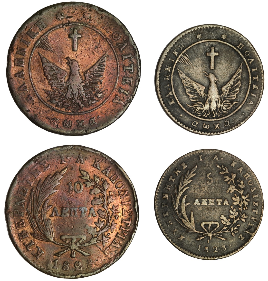 Greece. John Capodistrias (1828-1831). 5 and 10 Lepta, 1828. Phoenix, rays at left, cross above, within central circle, rev. Value within wreath, date below. KM 2,3. The second once cleaned as is common with these coins. Fine. (2)