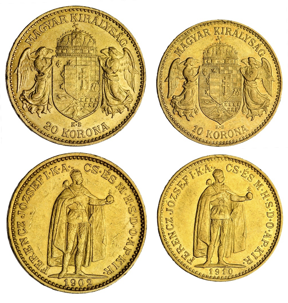 Hungary. Franz Josef (1848-1916). Pair of gold coins: 10 Korona, 1910 KB and 20 Korona, 1902 KB. Emperor in regalia standing ¾ right, rev. Crowned Arms supported by angels. KM 485, 486. Stacking marks. About Extremely Fine and About Uncirculated. (2)