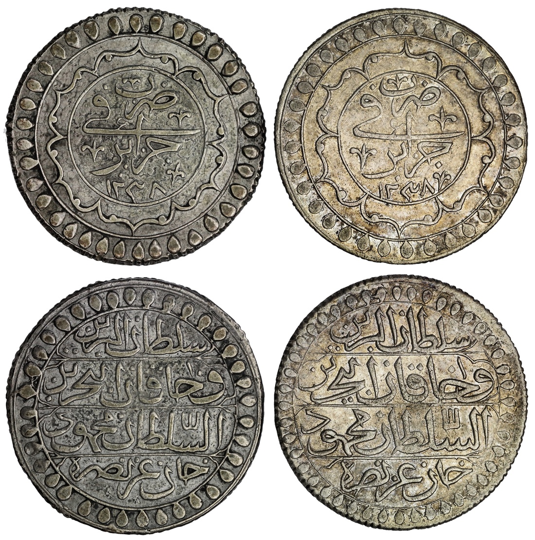 Algeria Ottoman. Mahmud II (AH 1223-1246/ 1808-1830 AD). Pair of Zudj (2) Budju, Jaza'ir, AH 1238. Four-line protocol,  Mint and date within petalled circle, outer teardrop border. KM 75. About Extremely Fine and Extremely Fine. (2)