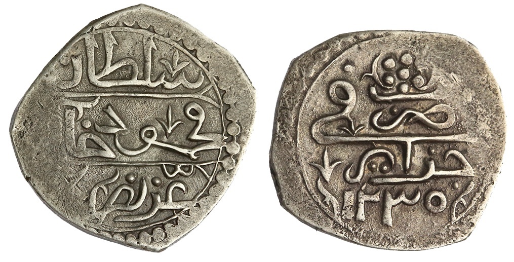 Algeria. Ottoman. Mahmud II (AH 1223-1246/1808-1830). 1/3 Budju (Tugrali-batlaka), Jaza'ir, AH 1235. 3.44 gm. Three-line legend. KM 63. Rare date. Good Very Fine.