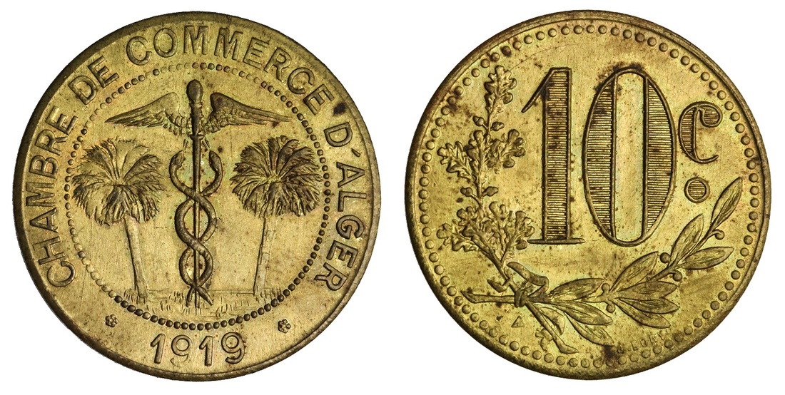 Algeria. French Occupation. Alger. 10 Centimes Token, 1919. Special issue in Brass. Caduceus between palm trees. KM TnA8. Toned with lovely iridescent highlights. AU-Uncirculated.