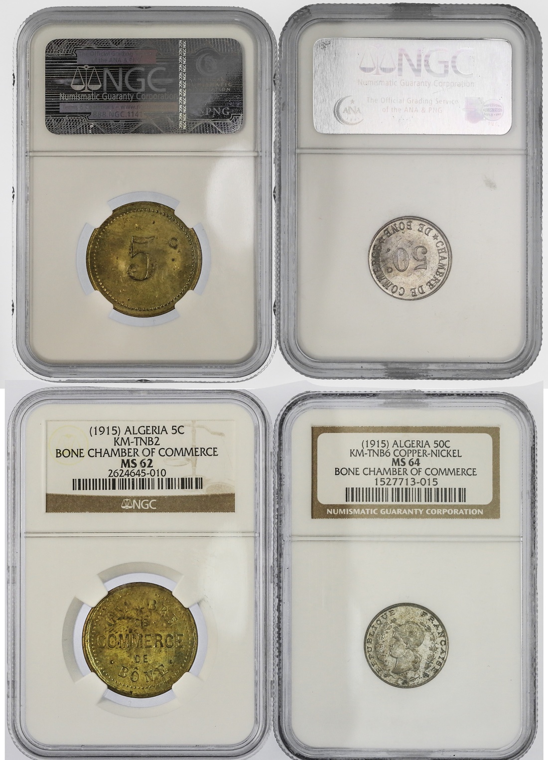 Algeria. French Occupation. Bone. Pair: 5 and 50 Centimes Tokens, nd (1915). Brass; Copper-nickel. Legends; Marianne head left within wreath. KM TnB2, TnB6. NGC MS 62 and NGC MS 64. (2)
