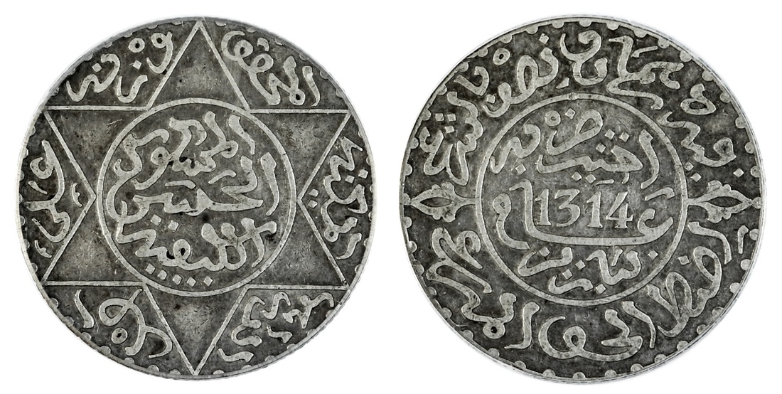 Morocco. Filali (`Alawi) Sharifs. Moulay al-Hasan I (AH 1290-1311/1873-1894 AD). 2 ½ Dirhams, Paris, AH 1314. Struck posthumously under `Abd al-`Aziz. Ruler's name in circle on Seal of Solomon, rev. Mint and date in circle, legend around. Y.6. Rare. PCGS XF 45.