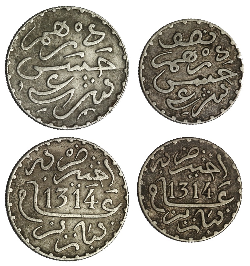 Morocco. Filali (`Alawi) Sharifs. Moulay al-Hasan I (AH 1290-1311/1873-1894 AD). ½ Dirham and Dirham, Paris, AH 1314. Struck posthumously under `Abd al-`Aziz. Y.4, 5. Rare. Very Fine. (2)