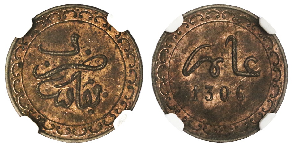 Morocco. Filali (`Alawi) Sharifs. Moulay al-Hasan I (AH 1290-1311/1873-1894 AD). ½ Falus, Fes, AH 1306. `am ("year") and numeral date in circle and outer border of open "C" rings, rev. Mint. Y.B1, Very Rare. NGC MS 62 RB.