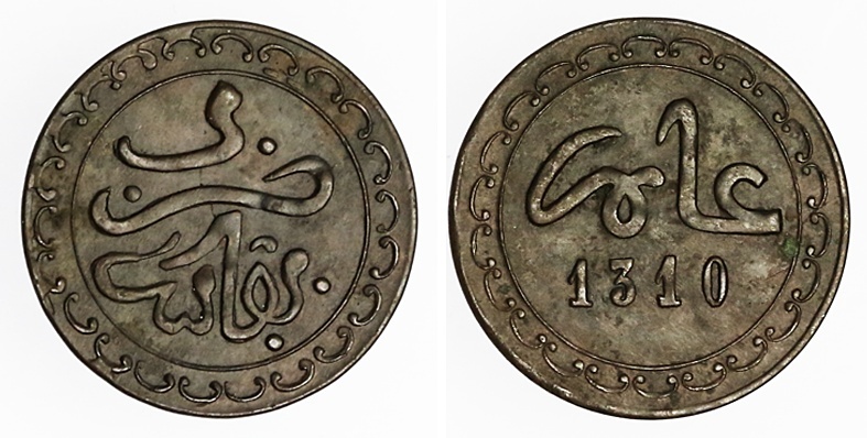 Morocco. Filali (`Alawi) Sharifs. Moulay al-Hasan I (AH 1290-1311/1873-1894 AD). ¼ Fals, Fes AH 1310. `am ("year") and date in circle, outer border of C designs, rev. Mint in same border. Y.C1. Rare. Tiny deposit. Extremely Fine.