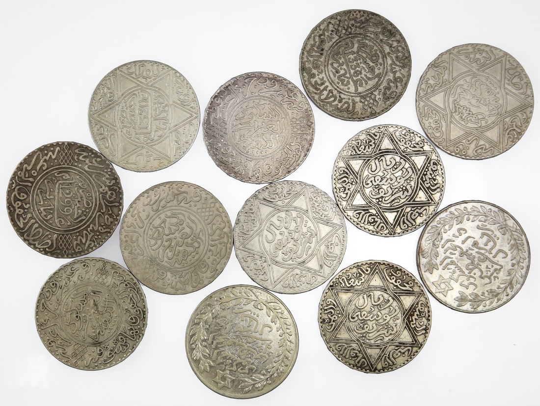 Morocco. Filali (`Alawi) Sharifs. Moulay al-Hasan I-Yusuf. One dozen Crowns. Includes Rials (10 Dirhams), AH 1299 (2), 1320 (2), 1321 (2), 1329 (2), 1331 (2), 1336 (2). Y.8, 22.1, 22.2, 25, 33. One polished, a few once lightly wiped. Very Fine-Good Extremely Fine. (12)