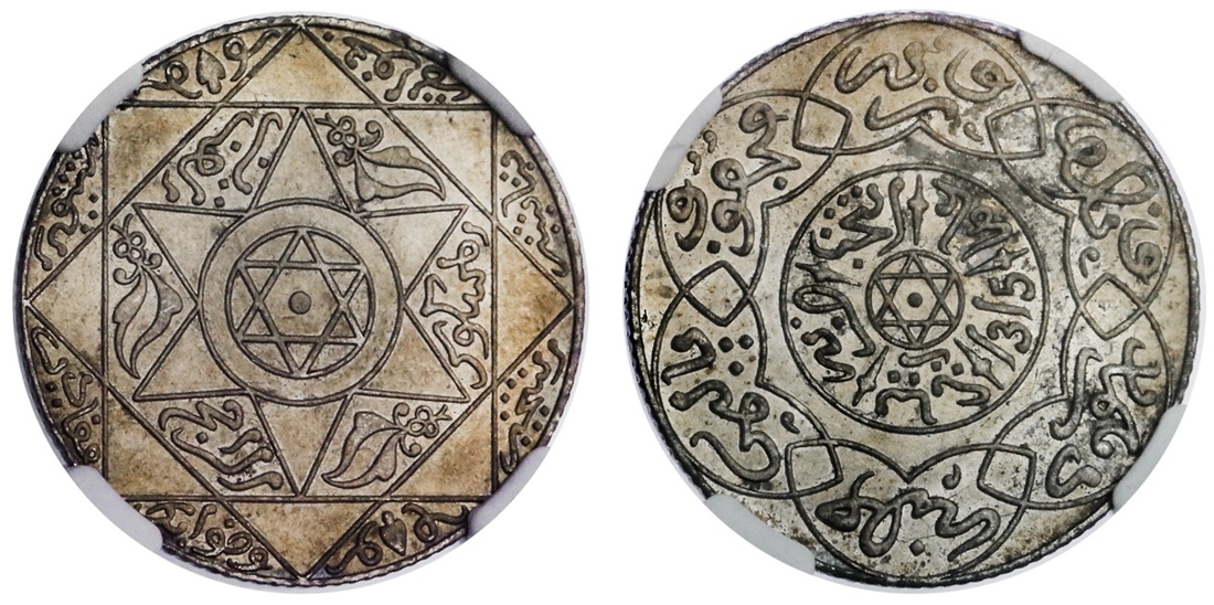 Morocco. Filali (`Alawi) Sharifs. `Abd al-`Aziz b. al-Hasan I (AH 1311-1326/1894-1908 AD). 2 ½ Dirhams, Paris, AH 1315. Seal of Solomon within circle within concentric Solomonic seals, rev. Mint and date around small Seal of Solomon within circle, legend in panels around. Y.11.2. Attractive toning. NGC MS 62.