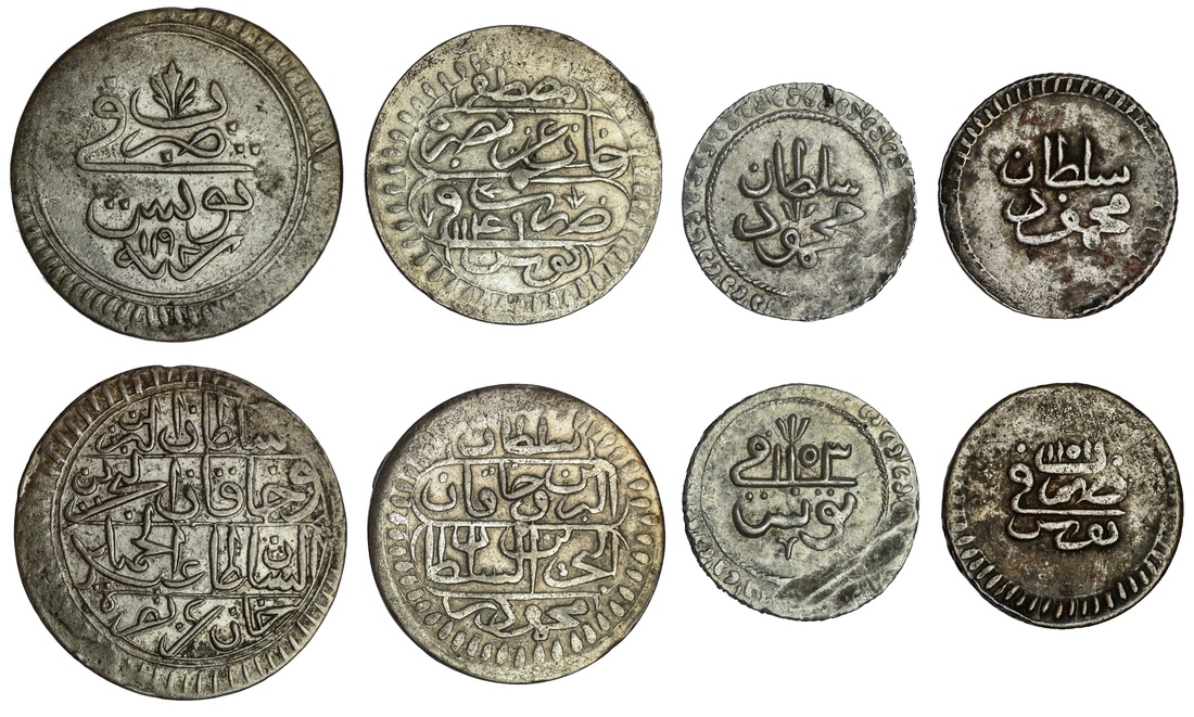 Tunisia. Ottoman. Mahmud I (AH 1143-1168/1730-1754 AD). 2 Kharub, Tunis, AH 1151, 1153. The first with duriba, the second without. KM 44.1, 44.2. Very Fine and Extremely Fine with die flaw on edge; ¼ Piastre, Tunis, AH 1149. KM 42. Extremely Fine; and `Abd al-Hamid I (AH 1187-1203/1774-1789 AD). 8 Kharub, Tunis, AH 1192. KM 64. Choice Very Fine. (4)