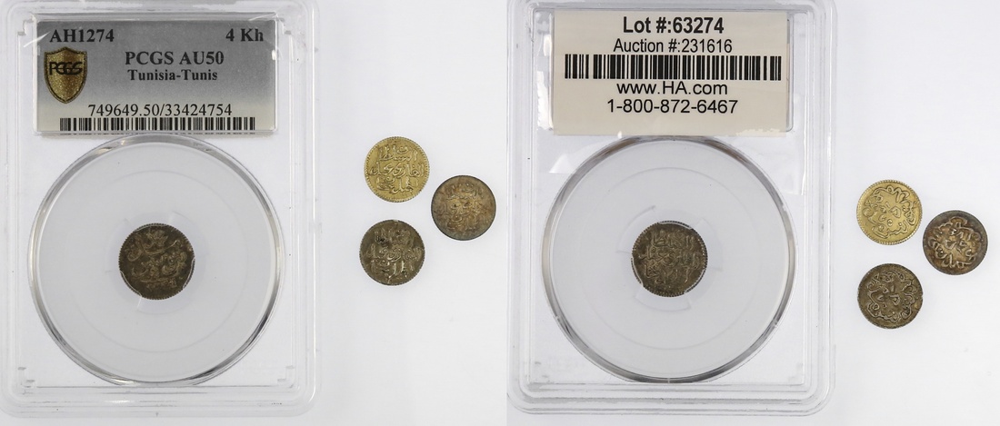 Tunisia. Ottoman. Sultan `Abd al-Mejid with Muhammed Bey (AH 1272-1276/1856-1859 AD). 4 Kharub, Tunis, AH 1274. PCGS AU 50; 2 Kharub, Tunis, AH 1274, 1275, 1276. al-Sultan al-`azizi `Abd al-Hamid Khan in three lines. KM 135, 132. Scarce. The 1275 lightly gilded. Extremely Fine. (4)