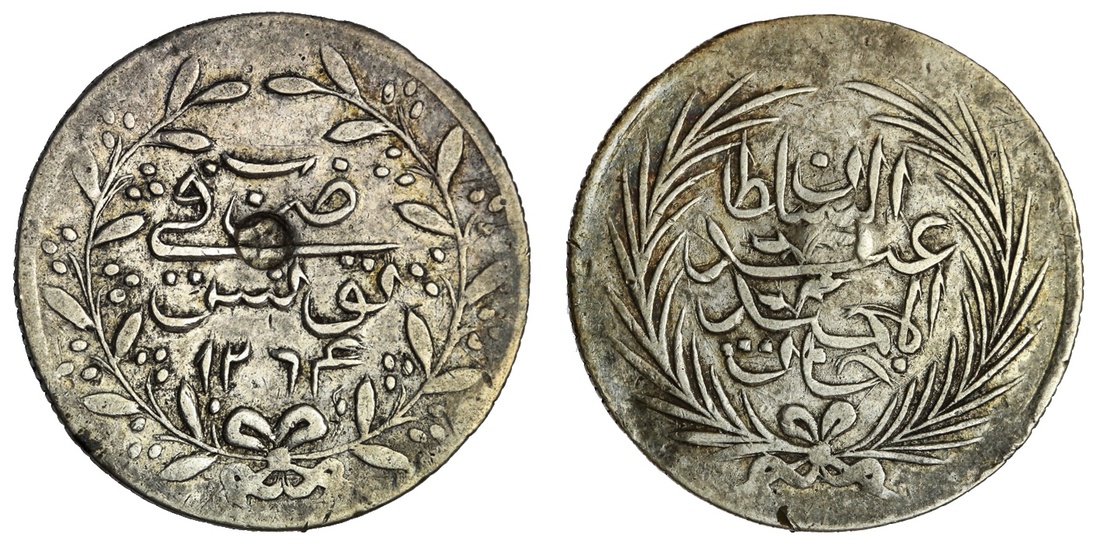 Tunisia. Ottoman. `Abd al-Hamid II with Muhammad al-Sadiq Bey (AH 1293-1299/1876-1882 AD). Countermarked coinage. 4 Piastres, (AH 1295). Star c/m on the reverse of a 2 Piastres (KM 106), AH 1264 of `Abd al-Mejid. It is quite unusual to find this countermark on such a much earlier coin. KM--. Rare. VF on a Fine+ host. Ex Stephen Album Auction 17, Sept. 19-21, 2013, lot 375.