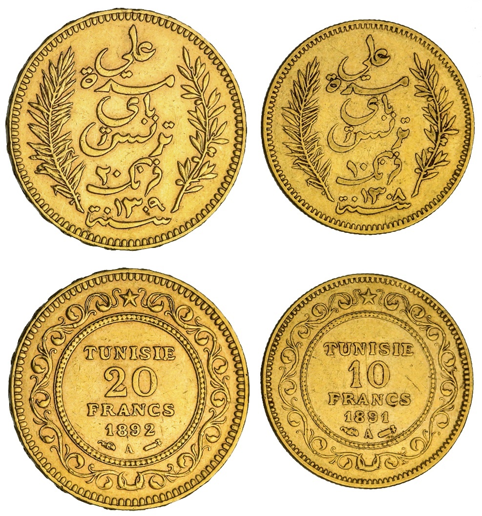 Tunisia. French Protectorate. `Ali Bey (1882-1902). Pair: 10 Francs, AH 1308 - 1891 A, and 20 Francs, AH 1309 - 1892A. Bey's Arabic legend, French legends. KM 226, 227. Very Fine. (2)