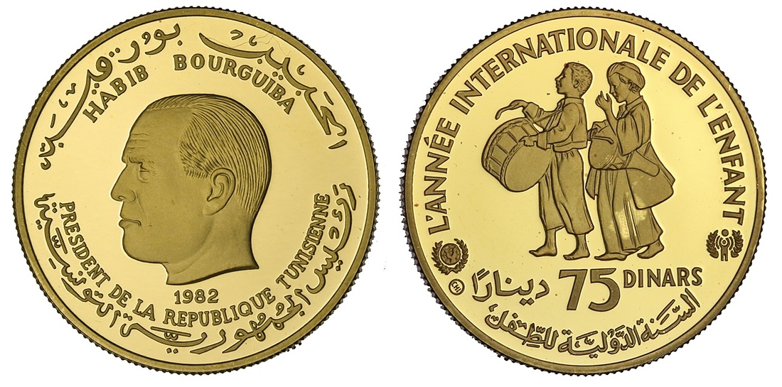 Tunisia. Republic. 75 Dinars, 1982. Unicef. Head of Bourguiba left, rev. Two children playing drums, walking left. KM 420. Minute mintage of just 21 pieces. Brilliant Proof.
