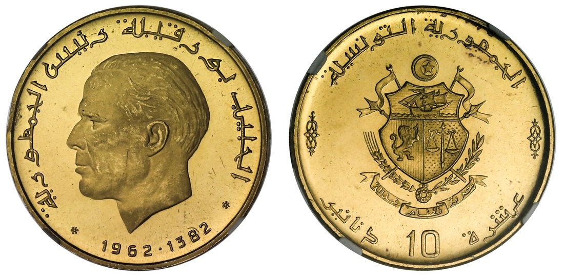 Tunisia. Republic. 10 Dinars, AH 1382 - 1962. President Habib Bourguiba head left, rev. Arms with flags above. KM 285. Rare. NGC PF 64 Cameo.