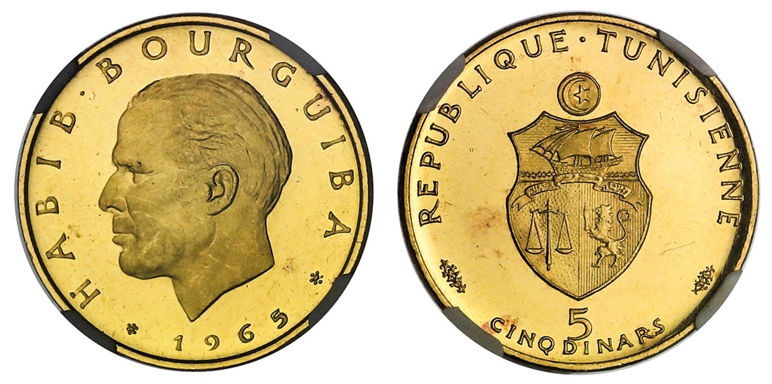 Tunisia. Republic. Gold 5 Dinars, 1965. President Habib Bourguiba head left, rev. Arms with flags above. KM 284 - unlisted date. Rare. NGC PF 64 Ultra Cameo.