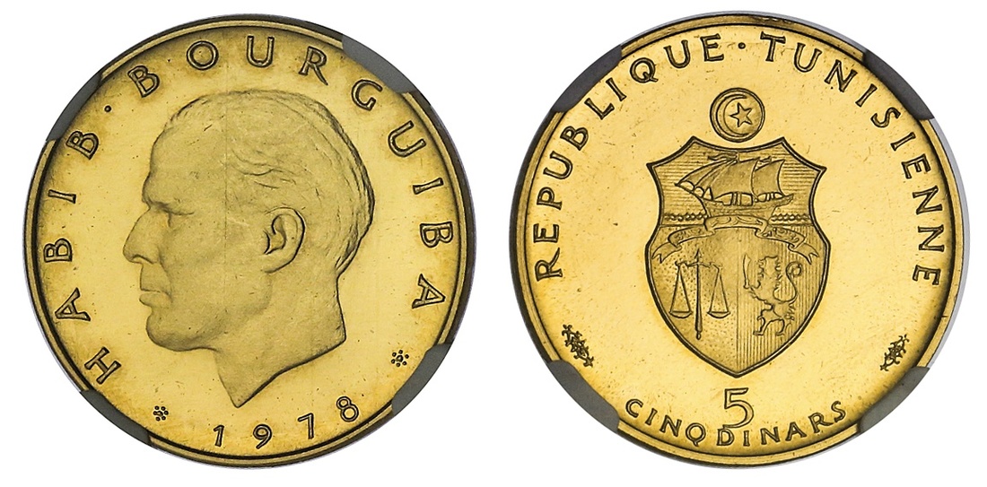Tunisia. Republic. Gold 5 Dinars, 1978. President Habib Bourguiba head left, rev. Arms with flags above. KM 325a. Rare. NGC PF 65.