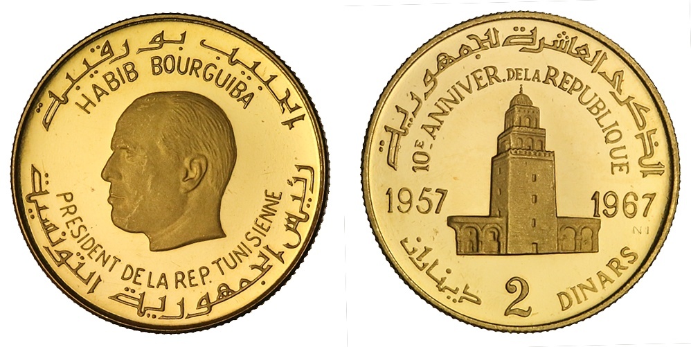 Tunisia. Republic. Gold 2 Dinars, nd (1967) NI. Arezzo, Italy. 10th Anniversary of the Republic. Bourguiba head left, rev. Tower flanked by anniversary dates. KM 286. Mintage of 7,259 pieces. Choice Brilliant Proof.