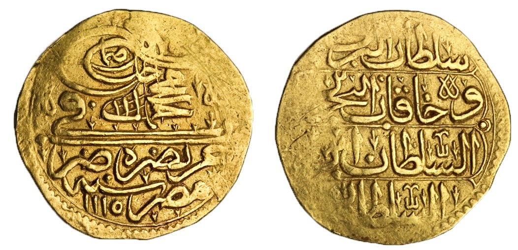 Egypt. Ottoman. Ahmed III (AH 1115-1143/1703-1730 AD). Altin, Misr, accession AH 1115. 3.43 gms. Toughra, `azz nasrahu, mint and date below, rev. Four-line protocol. NP 509, KM 73. Scarce. Minor flatness of strike right edge. Very Fine.