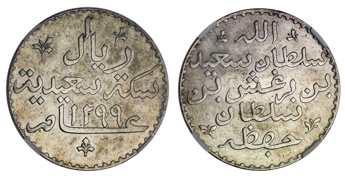 B>Zanzibar. Sultan Barghash b. Sa`id (AH 1287-1305/1870-1888 AD). Riyal, AH 1299 (1881/2). Protocol, rev. Value and date. KM 4. Pleasing pearly lustre, crisp strike. NGC AU 58.