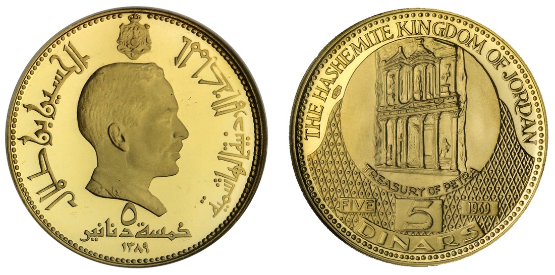 Jordan. Hussein b. Talal (1952-1999). 5 Dinars, AH 1389 - 1969. Bust right, small Arms above, rev. Treasury of Petra. KM 25. 1,950 pieces minted. NGC PF 69 Ultra Cameo.