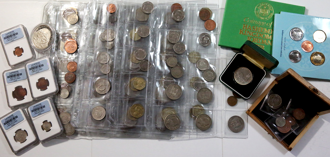 Jordan. Large study group. Includes: Commemorative silver issues -- Hussein b. Talal: 1969 Proof ½ Dinar- al-Harraneh, ¾ Dinar -Shrine of the Nativity, and Dinar- Jerusalem; 10 Dinars, 1980- 15th Century hijra; Proof 10 Dinars 1985 - King's 50th Birthday; Proof 5 Dinars, 1995- UN; Proof 5 Dinars, 1999- UNICEF; 3 Dinars, 1977 -Palestine sunbird; Proof 3 Dinars, 1981- IYC; 2 ½ Dinars, 1977 - Rhim Gazelle;`Abd Allah b. al-Hussein: Proof 10 Dinars, 1999- Accession; Proof 10 Dinars, AH 1420 (2000 AD) - Millenium-Baptism of Jesus; 1965 Proof Sets (2) in wood case, and individually encapsulated NGC PF 66-67; encapsulated Fils, 5, 10, 50 and 100 Fils, 1965, NGC MS 65-67, and 50 and 100 Fils, 1955. NGC MS 65 and 63; 1978 Proof Set, and various base metal minors - a number of years and types represented. Fine-Brilliant Uncirculated. (Approx. 250).