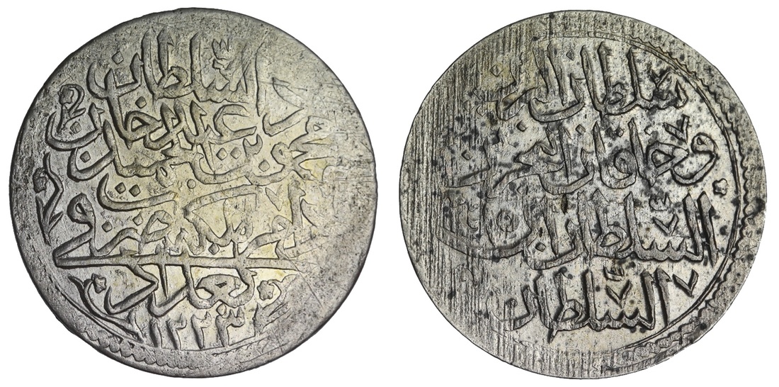 Iraq. Ottoman. Sultan Mahmud II (AH 1223-1255/1808-1839). 30 Para, Baghdad, accession AH 1223, year 15. 4.59 gms. Titles, mint and date, rev. Four-line protocol. KM 57. Typical light adjustment marks. Extremely Fine-About Uncirculated. Rare in this grade. Ex Stephen Album Auction 17, lot 319 where it realized $1,300.