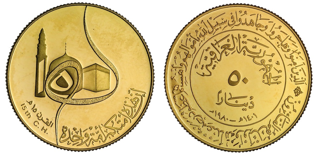 Iraq. Republic. 50 Dinars, AH 1401 - 1980. 15th Century of the Hijra. Stylized numeral '15' with mosque. KM 150. Mintage of 13,000 pieces. Some clouding in peripheries. Brilliant Proof.