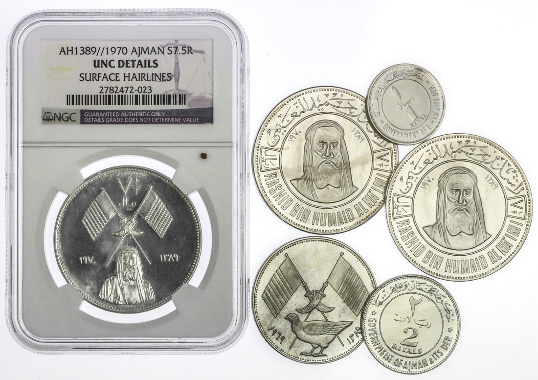 Ajman. Rashid b. Hamad al-Naimi (1928-1981 AD). Quintet: Riyal, 2 and 5 Riyals, AH 1389 - 1969; and 7 ½ Riyals, AH 1389 - 1970 (3 types). Sandgrouse beneath crossed flags and jambiya, value on reverse. Facing half-figure of ruler beneath crossed flags and jambiya, bonefish on reverse. Facing portrait of the ruler, Barbary falcon, Gazelle left on reverse. KM 1.1, 2.1, 3.1, 5, 6, 7. Some clouding on the Riyal and 2 Riyals. The first three Brilliant Proof, the first 7 ½ Riyals NGC Unc Details - surface hairlines, and the last two Brilliant Uncirculated. (6)