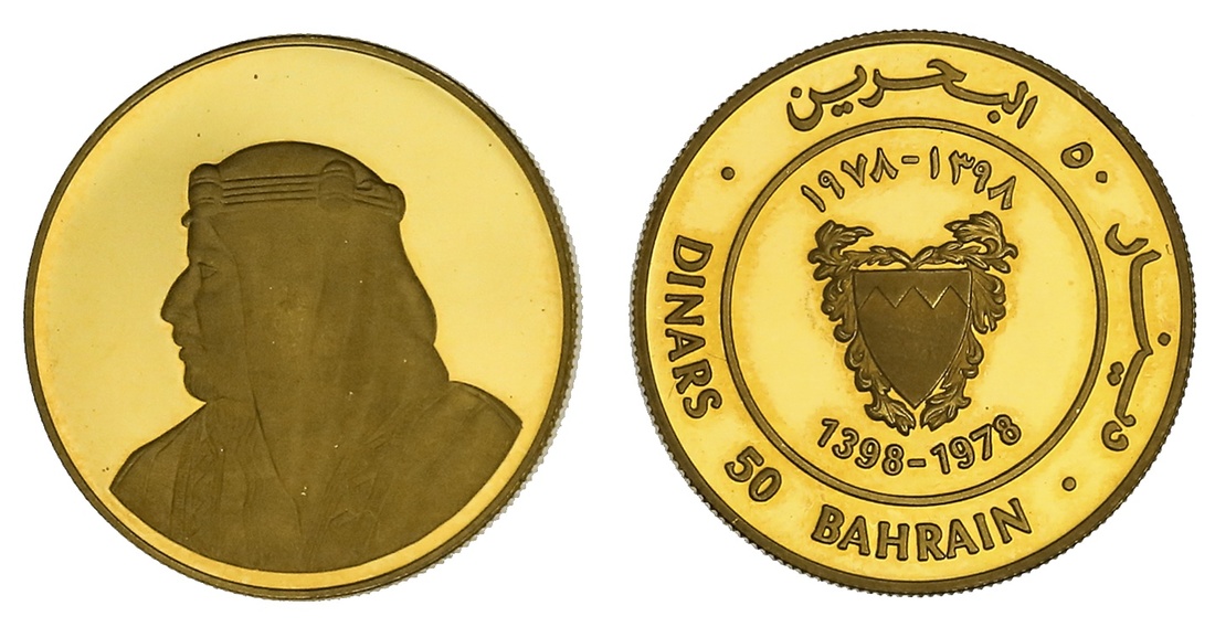 Bahrain. Isa b. Salman al-Khalifa (1961-1999 AD). 50 Dinars, AH 1398 - 1978. 50th Anniversary of the Bahrain Monetary Agency. Ruler's bust left, rev. Arms. KM 11. 5,000 minted. With original brown case. Choice Brilliant Proof.