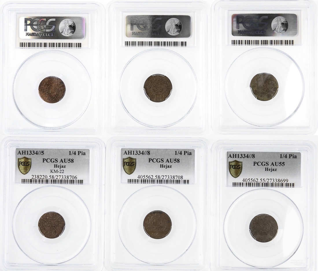 Hejaz. al-Husain b. `Ali (AH 1334-1342/1916-1924 AD). ¼ Qirsh (1/4 Piastre), accession AH 1334, years 5, 8 (2). Central legend in circle, legend around in four compartments. Central legend in beaded circle, legend around. KM 22, 25, PCGS AU 58, AU 58, AU 55. (3)