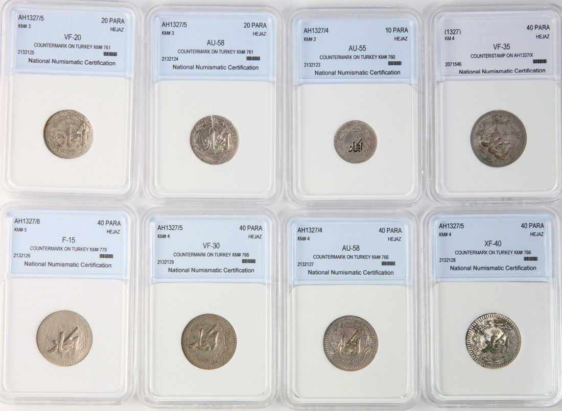 Hejaz. al-Husain b. `Ali (AH 1334-1342/1916-1924 AD). Countermarked Coinage, all in NNC graded holders. al-Hejaz c/m'd on Ottoman 40 Para of Mehmet V, accession AH 1327, years 4, 5 (2), 8 and not visible (covered by c/m). AU 58, Xf 40, VF 30, F 15, VF 35; 20 Para, accession AH 1327, years 5. VF 20, AU 58; and 10 Para, accession AH 1327, year 4. AU 55. KM 2-5. The last Rare. (8)