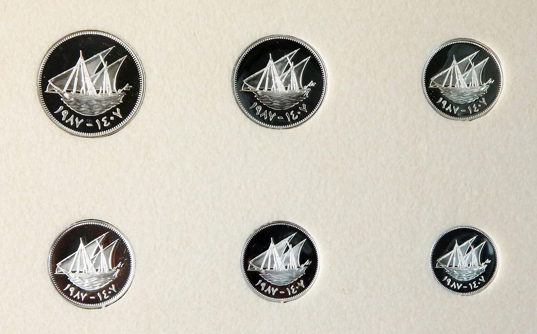Kuwait. Jabir al-Ahmad al-Sabah (1977-2006). AH1407 - 1987 Silver Proof Set. 1 to 100 Fils, all struck in sterling silver. Dhow. KM PS3. In original Central Bank of Kuwait brown case. Very Choice Brilliant Proof.