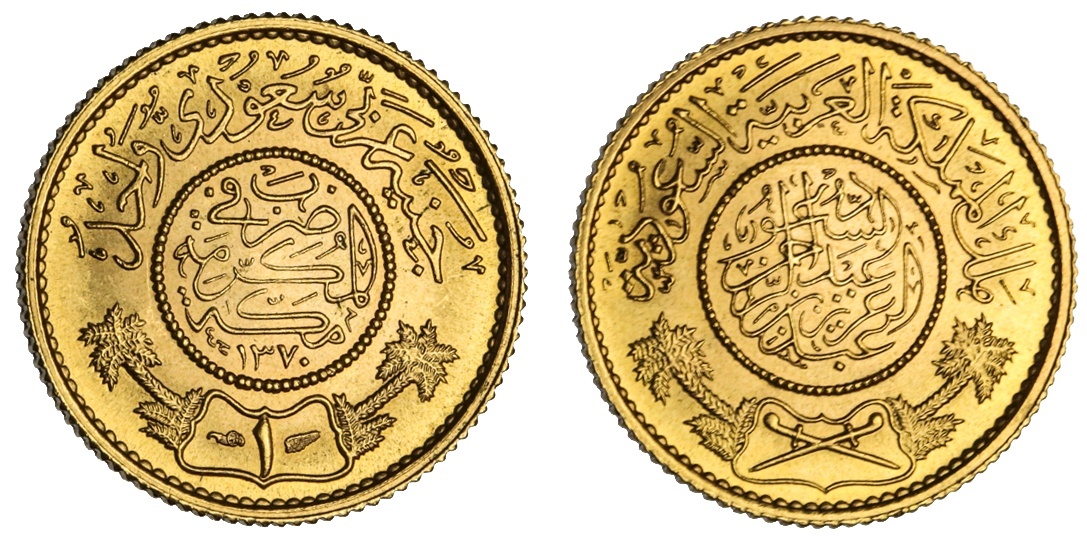 Saudi Arabia. `Abd al-`Aziz b. Sa`ud (AH 1344-1373/1926-1953 AD). Guinea, AH 1370. Legend in beaded central circles, crossed swords flanked by palms below, legend around. Numeral value below on reverse. KM 36. Pristine surfaces, crisply defined edges, rich lustre. Very Choice Brilliant Uncirculated.
